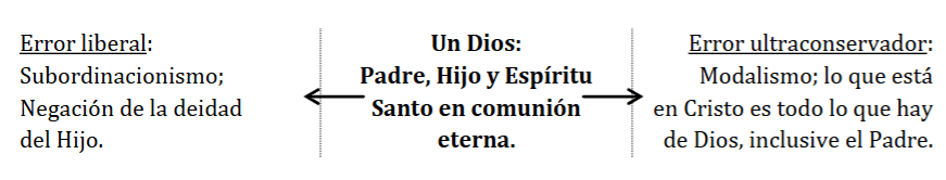 Sin embargo, ya que las verdades negadas son verdades tan diferentes (la divinidad y la preexistencia eterna), no es finalmente acertado clasificarlas de esta manera. Calvino se quejaba de los herejes diciendo “los cuales, no atreviéndose claramente a quitarle su divinidad, le despojan en secreto de su eternidad”. (Institución, I:13, sección 8. Note sin embargo que sus oponentes enseñan una palabra sobre el comienzo de su existencia en la creación; así que esta cita no es de un contexto en el cual él se dirigía a modalistas del tipo unicitario). Recomiendo ver la doctrina cristiana de la Trinidad como la forma correcta de entender la persona de Jesucristo, con el subordinacionismo como el error liberal y el modalismo como el error ultraconservador. Ambos son igualmente malos, pero yerran en lados opuestos de cada uno.